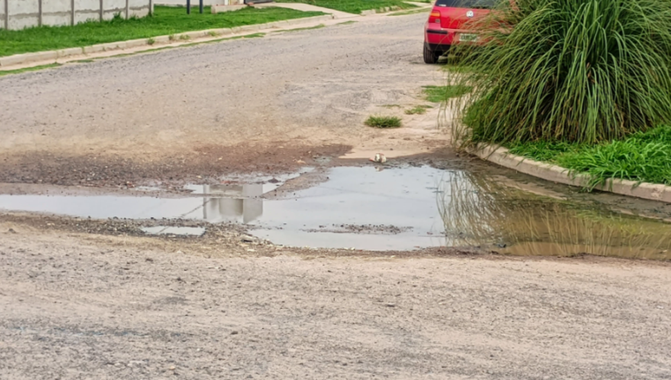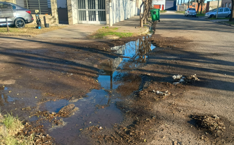 Aquí el problema resulta fácilmente visible. Un bache lleno de agua que ocupa todo el ancho de la calzada. En este caso los vecinos hicieron varios reclamos junto con otras peticiones relacionadas con el barrio, a finales del año pasado hablaron con concejales del bloque Unión por la Patria y les expusieron en problema, los ediles realizaron una presentación que pasó a Comisión y no recibió resolución. Días pasados volvieron a reunirse, esta vez con los concejales de La Libertad Avanza, que también presentaron un proyecto, con idénticos resultados. Las quejas en esta zona también incluyen la seguridad, la limpieza y el tanque de agua, que está deteriorado y presenta importantes pérdidas, justamente el agua acumulada en el bache es la que gotea desde el tanque.