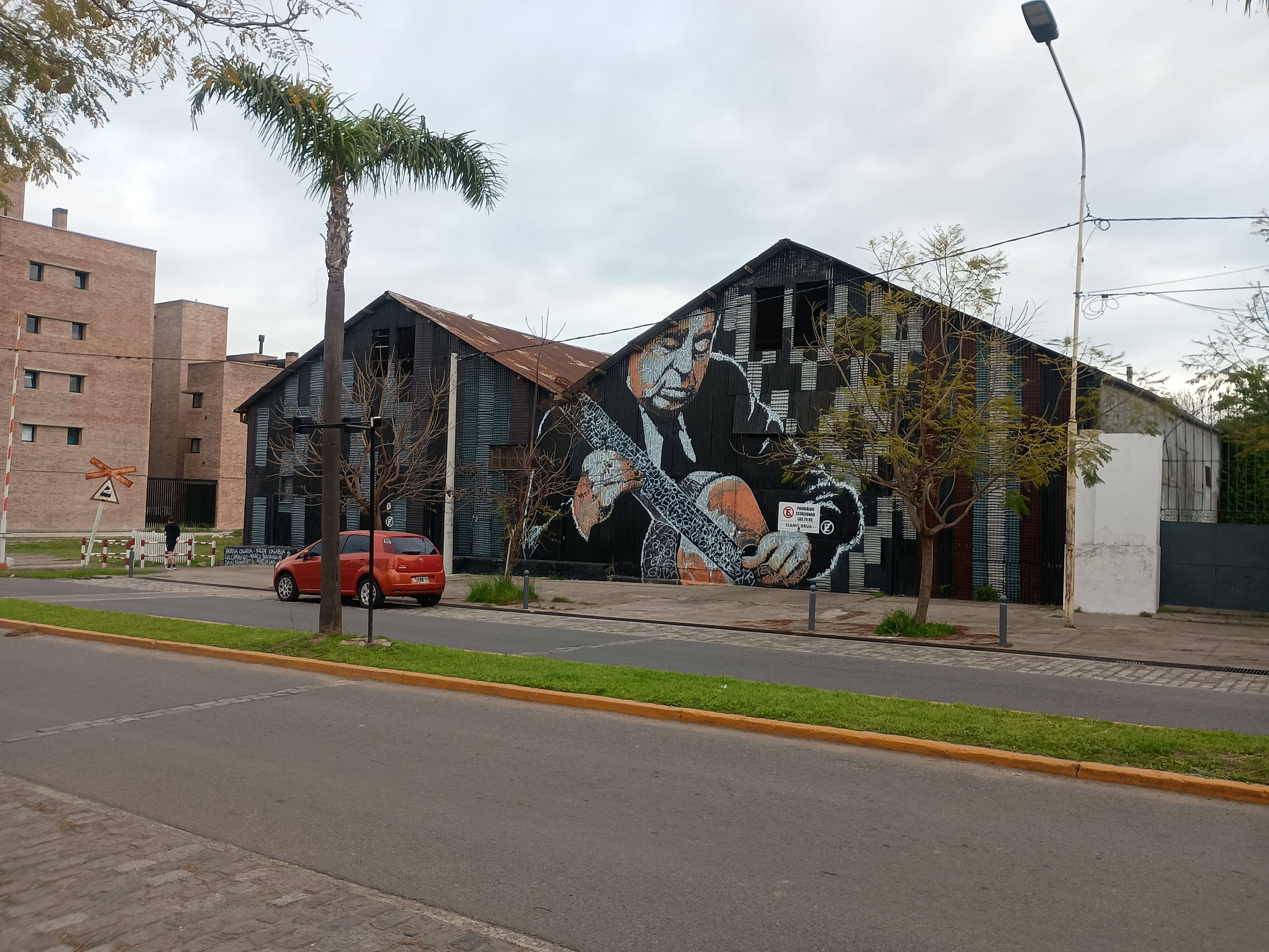 Plaza de los Ferroviarios con monumento a Atahualpa Yupanqui. Abajo, mural de "Don Ata" pintado por artistas locales.
