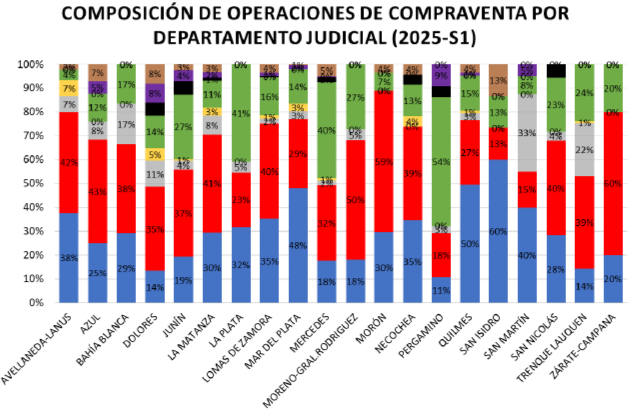 Si hay un indicador que define la dinámica de Pergamino, es la composición de sus operaciones de compraventa. El informe revela que, a nivel provincial, el mercado es fuertemente residencial (dos de cada tres actos son casas o departamentos), pero también muestra un creciente interés por la tierra, que ya representa el 21% de las transacciones totales.