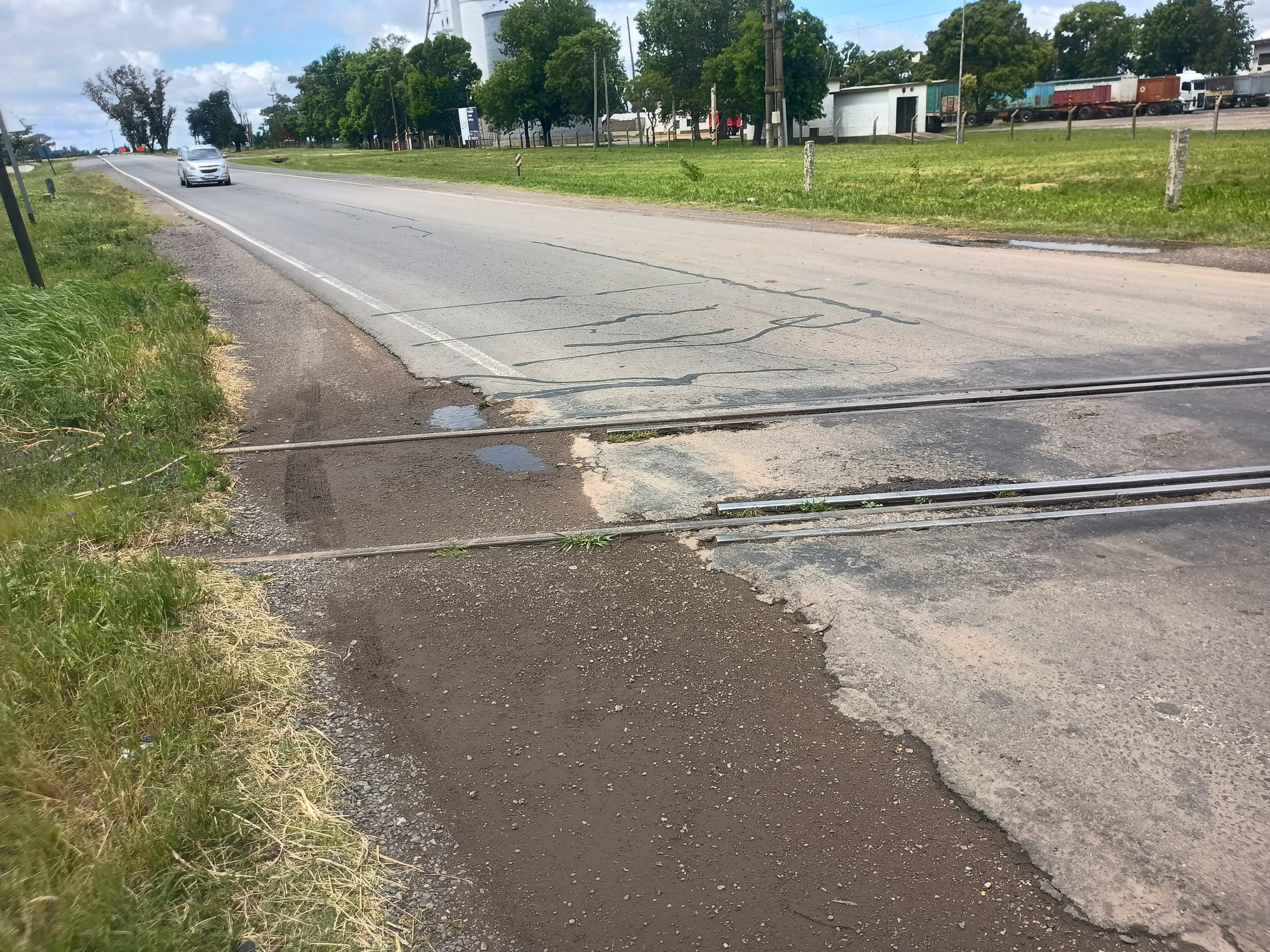 Paso a nivel en la Ruta 8, en las proximidades del parque industrial Parcum, totalmente deteriorado.
