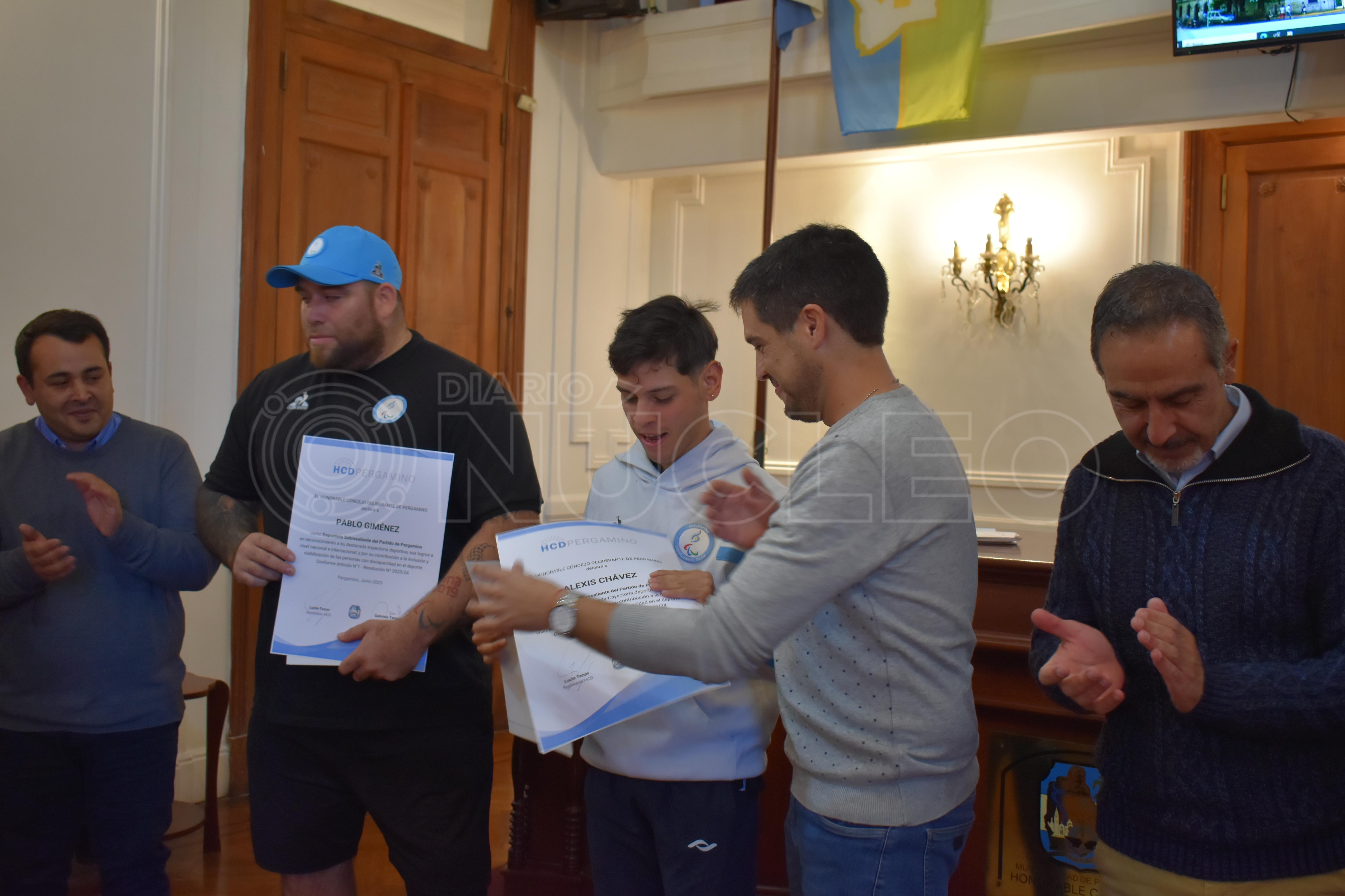 Por su parte, Fiore Pitrelli expresó: “Sé por lo que veo, por lo que leo lo que es la constante de cada día de ustedes. Ustedes dos como deportistas de nuestra ciudad forman parte del top ten del mundo, algo que es sumamente destacable, porque siempre se han entrenado en nuestra ciudad, eso habla de la calidad de nuestros profesores, de nuestros clubes, de nuestro deporte, que muchas veces discutimos acá en el Concejo Deliberante cómo debiera ser, pero siempre en carácter positivo para que todos tengamos las posibilidades que tienen ustedes. Ustedes son ejemplo, todos los días se levantan a pesar de las adversidades que tienen, económicas, físicas, y nos demuestran y nos invitan a participar del deporte. Nos invitan a llevar a una vida sana, inspiran a generaciones, a jóvenes. Y el Concejo Deliberante que los reconozca es el reconocimiento del pueblo de Pergamino por la labor que hacen ustedes”.