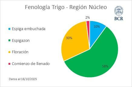 En el sudeste de Córdoba se reportan lotes con 600 espigas/m2, en Bigand, “se cuentan 560 espigas/m2”, en Carlos Pellegrini o Aldao miden 500 espigas/m2, por ejemplo. En la región se observa que el 85% del área triguera se encuentra en condiciones muy buenas a excelentes; el 13% buena y el 2% regular por anegamientos. “El sol y el viento nos está sacando de encima el gran riesgo que veíamos de fusariosis”, dicen en Aldao y agregan: “si seguimos teniendo noches frescas y más cuando nos toque el llenado, apuntamos a rendimientos explosivos”.