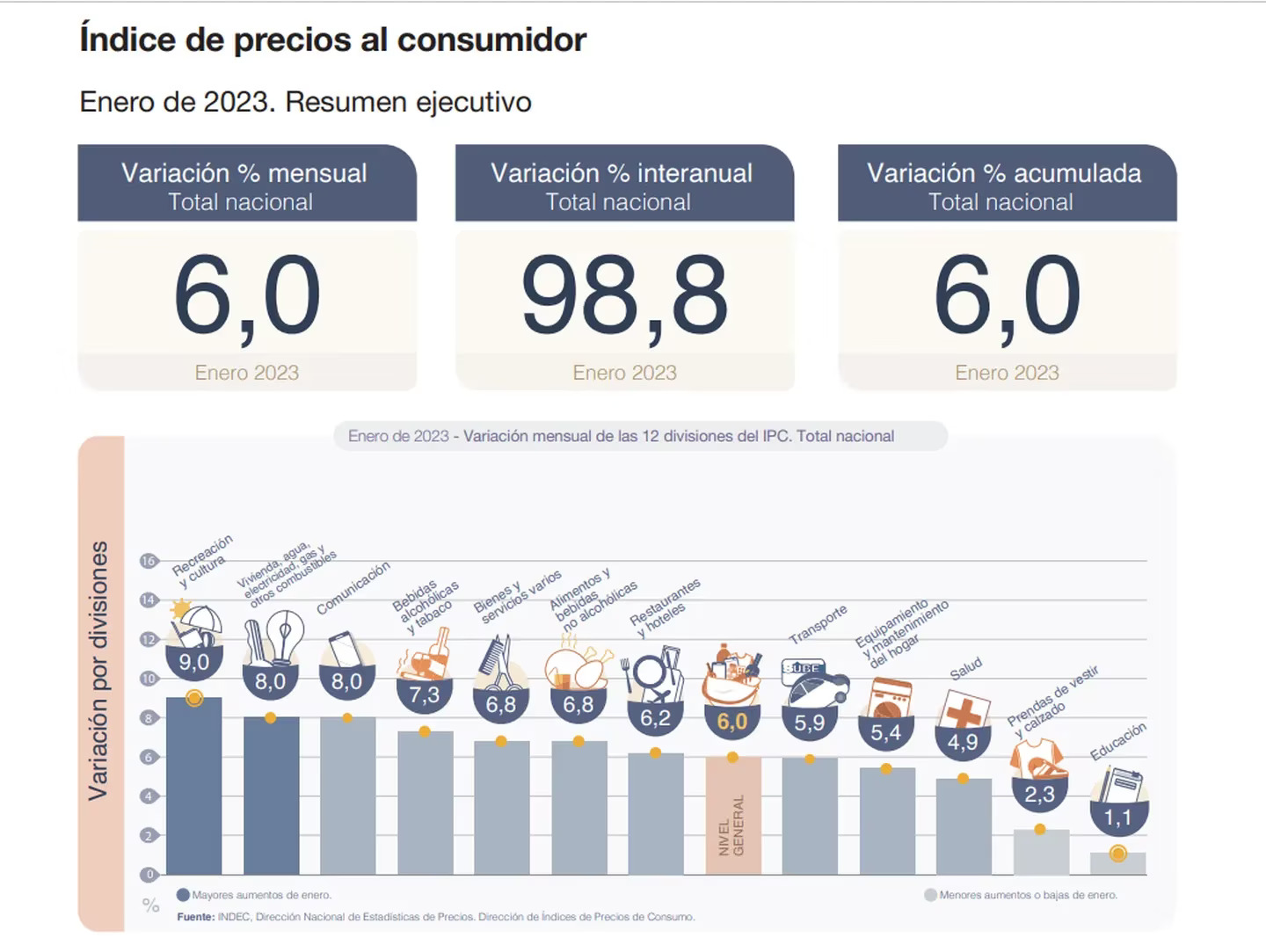 La inflación de enero fue de 6,0 %, acelerando en un 0,9 puntos porcentuales respecto del 5,1% de diciembre. En tanto que el índice interanual en el primer mes del año alcanzó el 98,8%, según informo el INDEC.