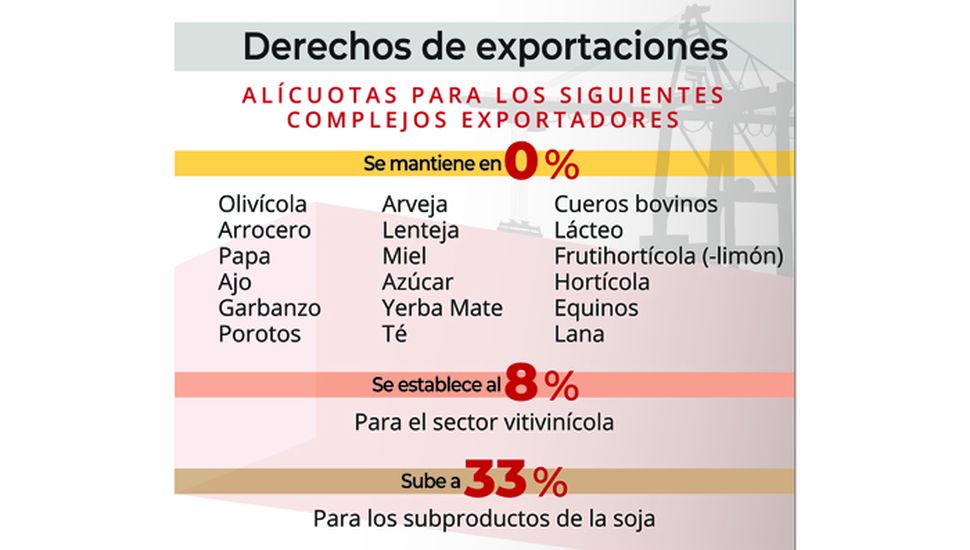 La iniciativa prevé llevar al 8% las retenciones a las exportaciones del sector vitivinícola, mientras que la de subproductos de soja, como la harina y el aceite, igualarán la alícuota del poroto sin procesar, que en la actualidad se ubica en el 33%. Asimismo, queda firme la decisión de aumentar al 15% la alícuota para maíz, trigo, girasol y carne vacuna, entre otros complejos.