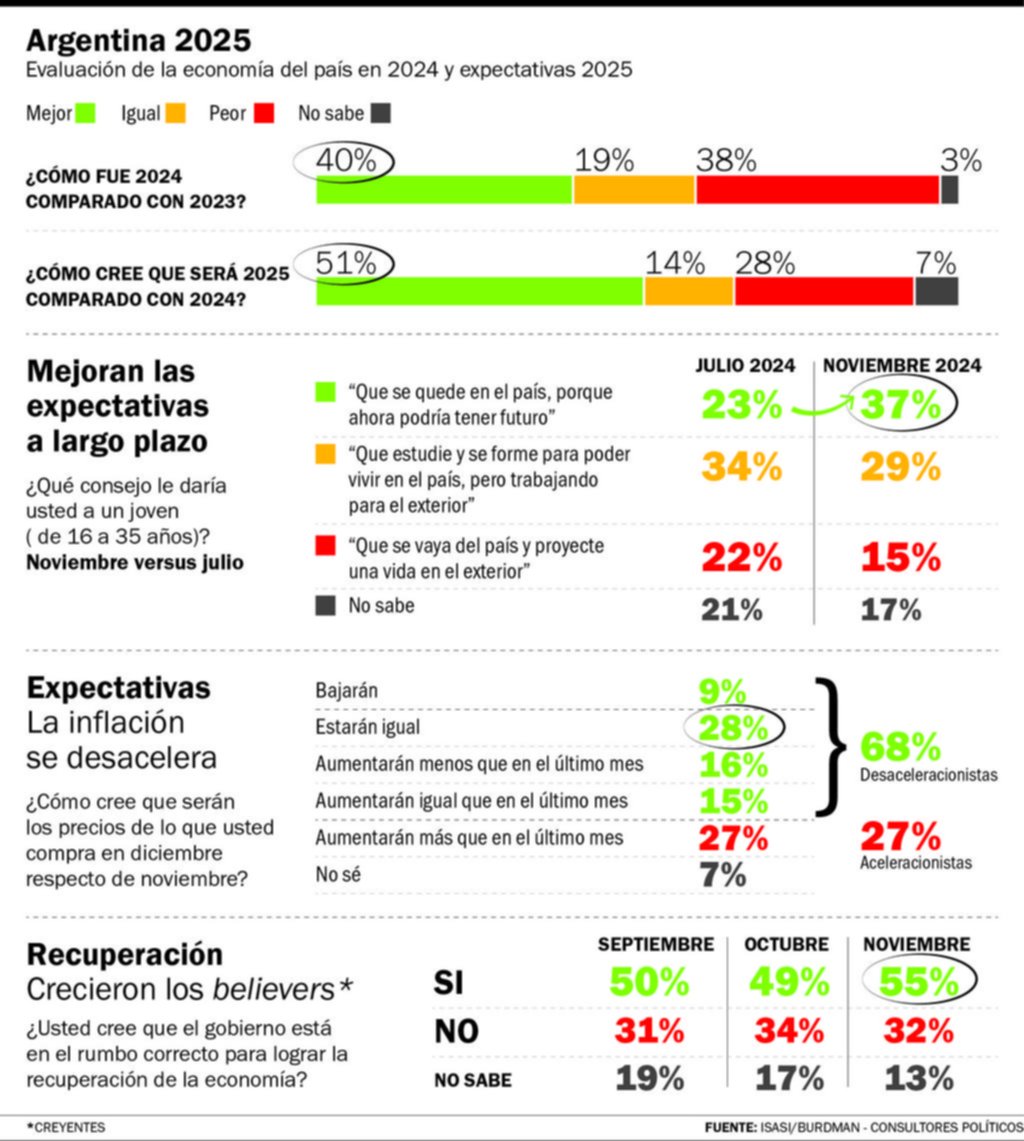 Según los resultados de la encuesta de noviembre realizada por el Estudio Isasi-Burdman, un 51% de los argentinos considera que el 2025 será un mejor año económico que 2024. Lo sorprendente es que este optimismo no tiene un sesgo significativo de edad: todos los grupos etarios, incluidos los sub-35 -que representan el 40% del padrón electoral en Argentina-, comparten la misma visión esperanzadora. Este cambio de mentalidad es un claro indicador de que los jóvenes argentinos han dejado atrás el pesimismo y ahora se sienten parte de una nueva etapa, con expectativas más altas para el futuro.