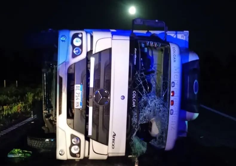 Por motivos que son materia de investigación, el conductor de un Mercedes Benz Atego blanco perdió el control, despistó y quedó volcado sobre la cinta asfáltica. Como consecuencia del siniestro, el conductor de 28 años, oriundo de la localidad bonaerense de Villa de Mayo resultó ileso afortunadamente.