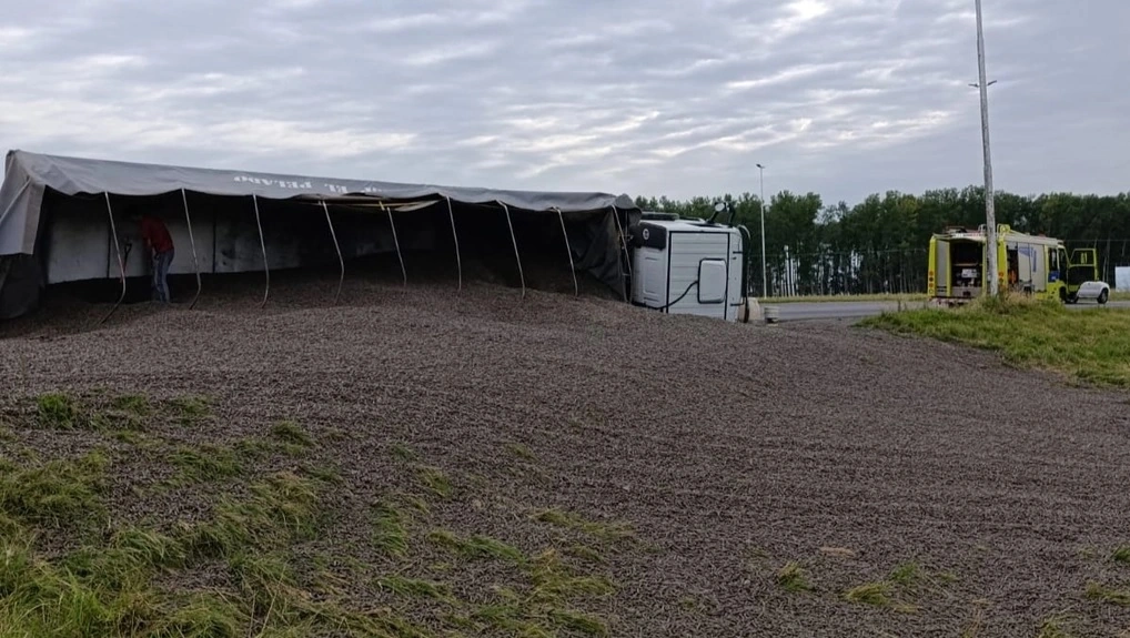 El hecho ocurrió alrededor de las 06:30 horas, cuando un camión marca Fiat Iveco, perteneciente a la firma “El Pelado”, volcó por causas que aún se investigan, mientras circulaba por la rotonda cercana a uno de los accesos a la ciudad. El vehículo era conducido por un hombre de 38 años, oriundo de la ciudad de Bolívar.