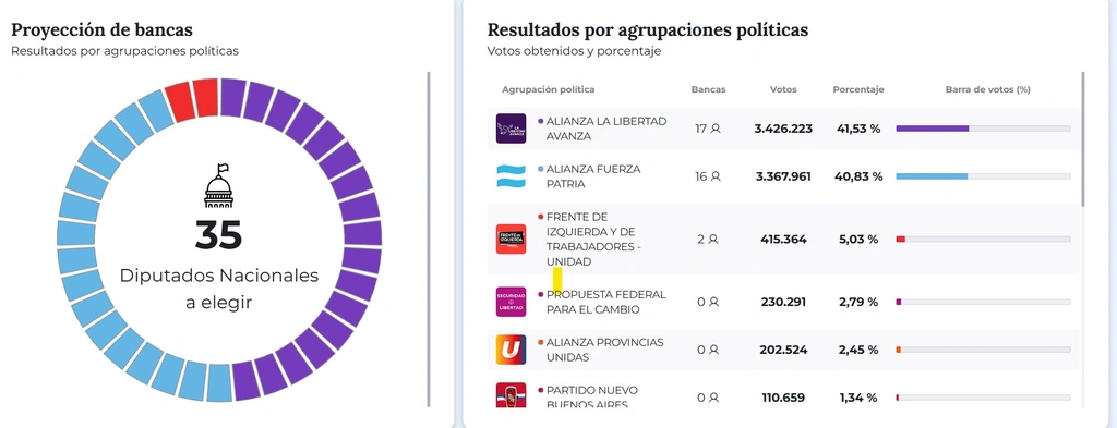 La Libertad Avanza obtuvo el 41,53% de los sufragios (3.426.223 votos) y se quedará con 17 de las 35 bancas en juego, mientras que la Alianza Fuerza Patria logró el 40,83% (3.367.961 votos), asegurándose 16 escaños.