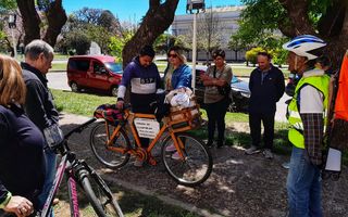 Pasó por Colón un peregrino que viaja a Lujan en una bicicleta de madera